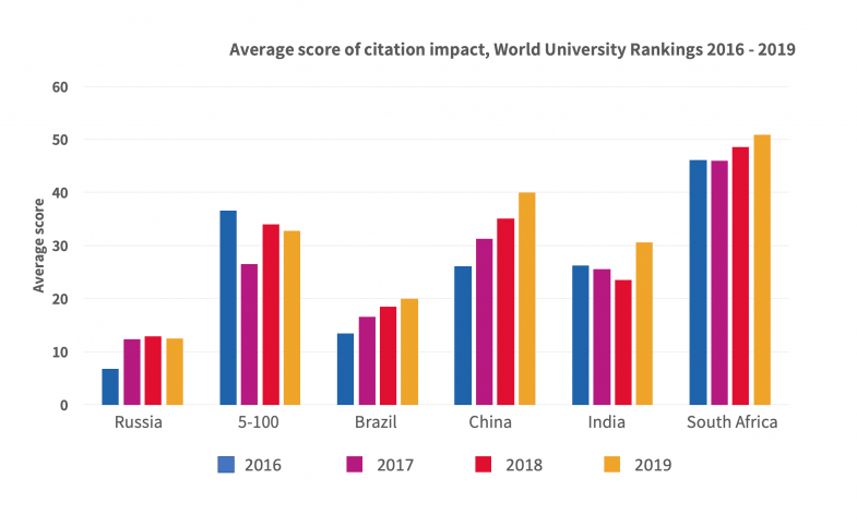 Up to 2019, the average citation impact scores for 5-100 universities were yet to show any significant rise, while China (shown here as all institutions but this will mostly be Double First Class universities) leaped ahead and other emerging nations such as Brazil were climbing despite not having any flagship initiative.