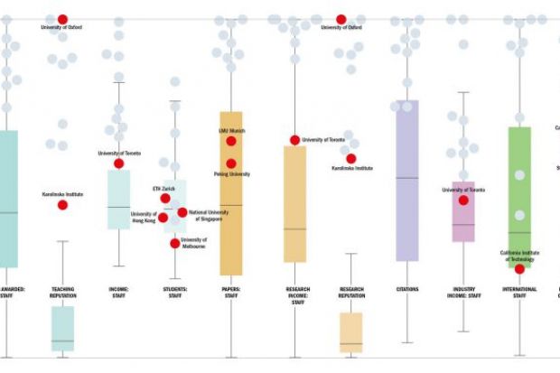 But there are other individual metrics with an interesting spread of scores. These include staff-to-student ratio, where the University of Melbourne comes in under the lower quartile, and five others (including ETH Zurich – Swiss Federal Institute of Technology Zurich, the National University of Singapore and the University of Hong Kong) are bunched around the median. The measure of papers per academic staff is also interesting, with Peking and LMU Munich scoring above the median but not as well as other members of the elite.