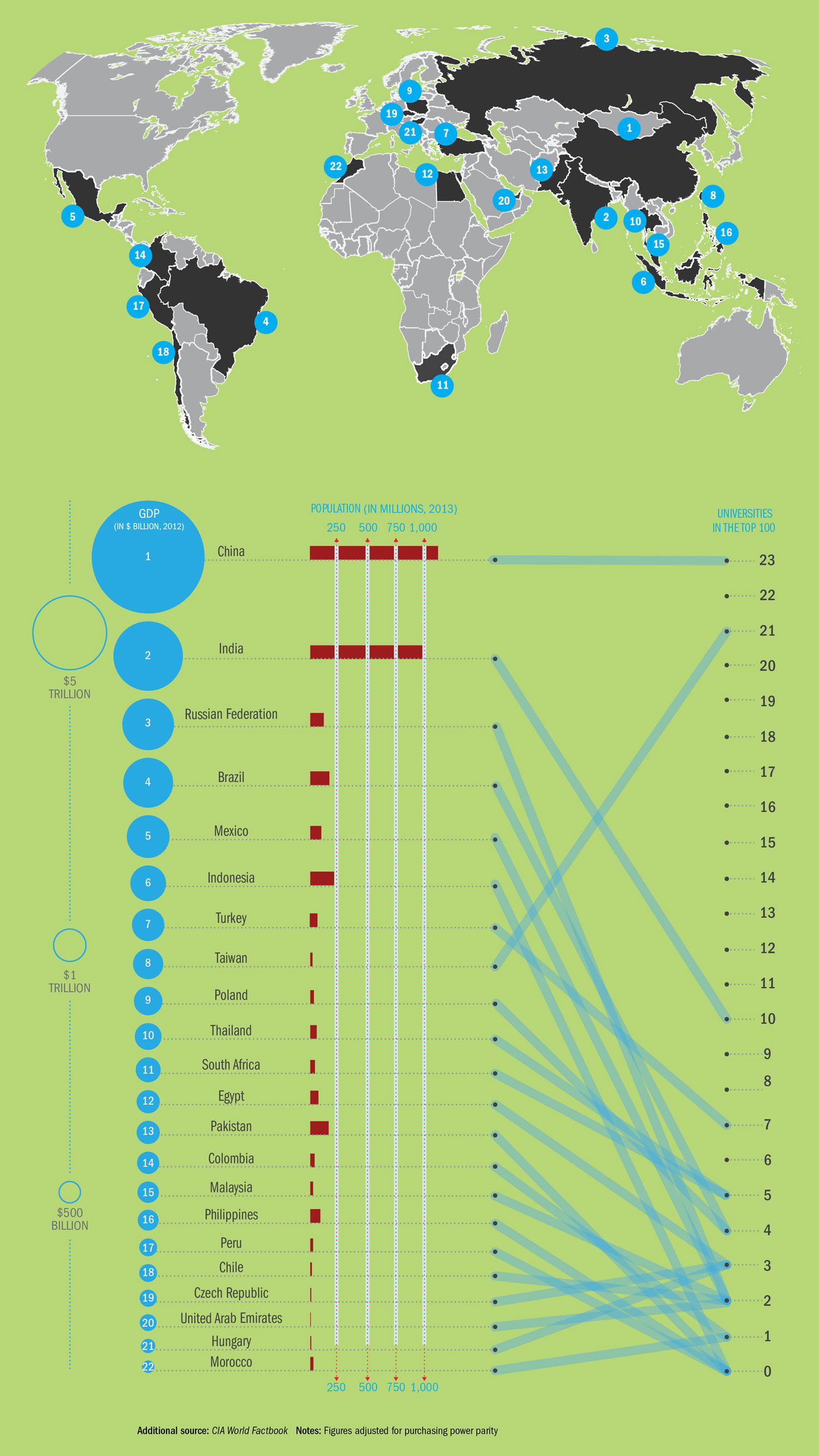 All 22 countries considered for analysis in the Times Higher Education BRICS & Emerging Economies Rankings 2014 are rising powers.