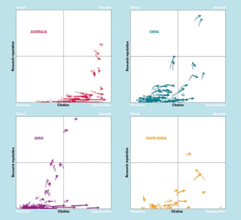 South Korea has a more positive picture: there is evidence that a batch of universities are improving on citation impact, while some that already scored well appear to be gaining on reputation, too.