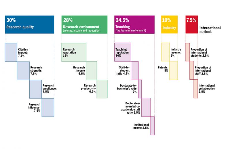 The performance indicators are still grouped into five areas, although the names of these have been tweaked: Teaching (the learning environment); Research environment (volume, income and reputation); Research quality (citation impact, research strength, research excellence and research influence); International outlook (staff, students and research); and Industry (income and patents).