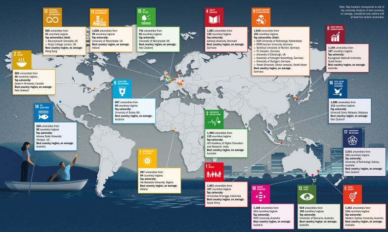 Excellence in the individual SDGs is not constrained by geography, with a variety of institutions and regions carving out areas of expertise, as the graphic below shows (click image to view a larger version).