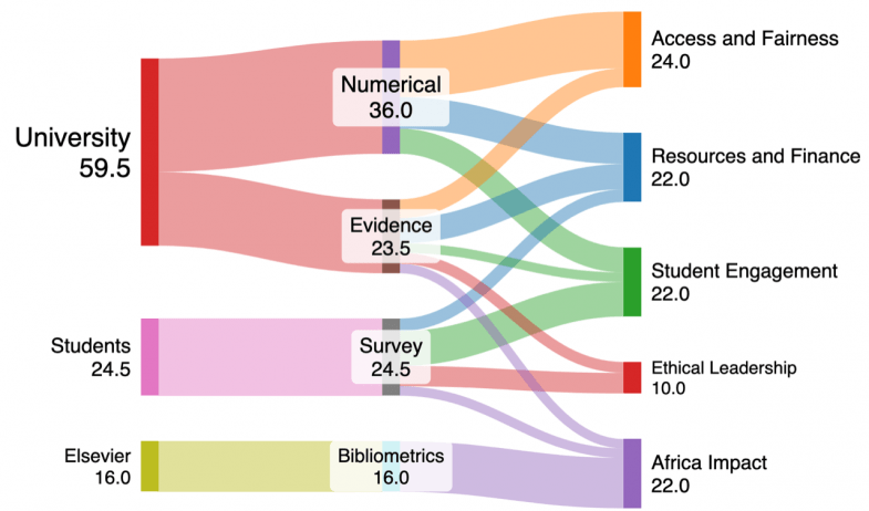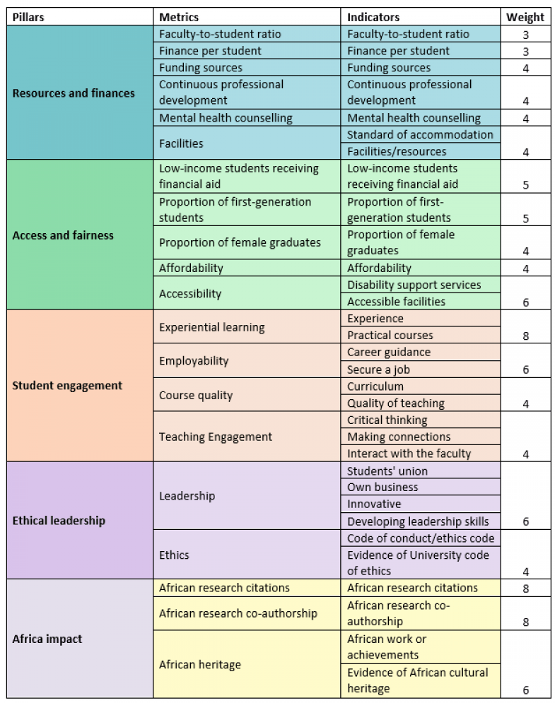 This second edition of the rankings introduces significant updates to the original methodology. After consultation with university stakeholders in SSA, we added a new pillar – ethical leadership – as well as some new metrics. We have reorganised existing metrics to fit around this new structure, and also removed some metrics. Changes are detailed in the relevant pillar sections below. When metrics are composed of more than one indicator, those are indicated in italics.