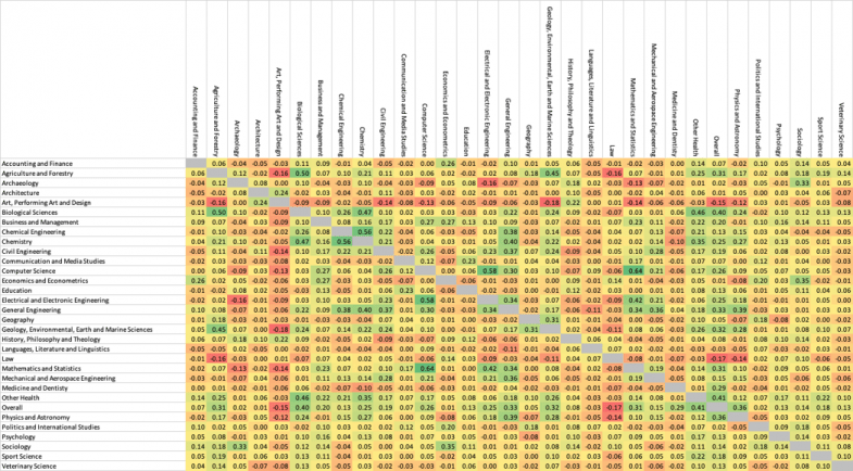 A useful indicator was provided by my colleague Billy Wong – an analysis of how the performance of universities (in this case our traditional bibliometric measure, field-weighted citation impact) correlates across different subjects (with a high positive correlation signalling that the institution is performing well in both fields). There’s no surprise that we see computer science and engineering correlate strongly, or that we see that farming and fine arts have a negative correlation.